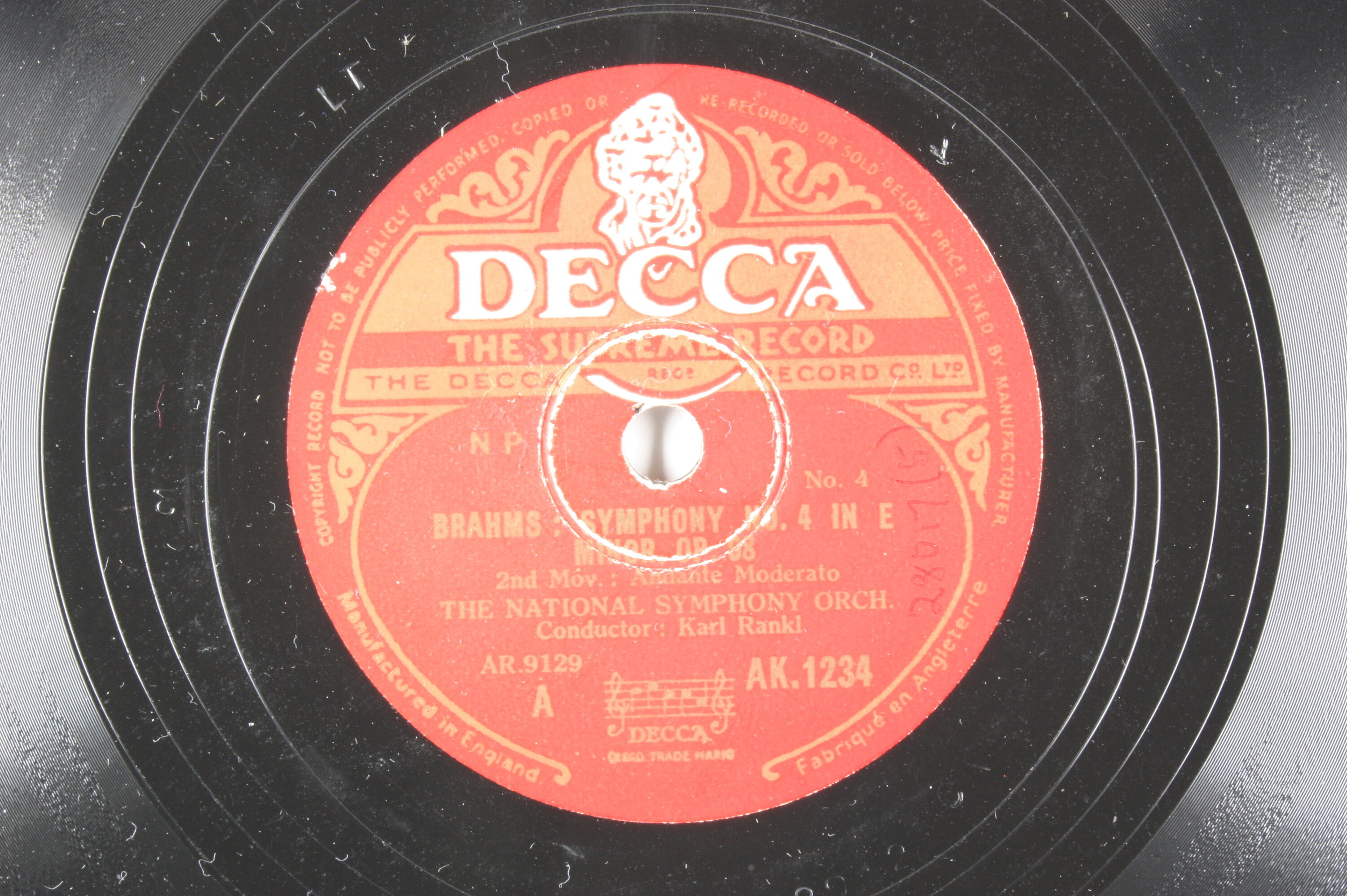 TYPE: DECCA 12 IN. CONTENTS: "SYMPHONY NO. 4 IN E MINOR OPUS 98", PLAYED BY THE NATIONAL SYMPHONY ORCHESTRA, CONDUCTED BY KARL RANKL. COMPANY: DECCA ELECTRICAL. TYPE DETAILS: DOUBLE SIDED. 5 DISCS IN SET. COMMENTS: CAT. NOS. AK1231- 1235.