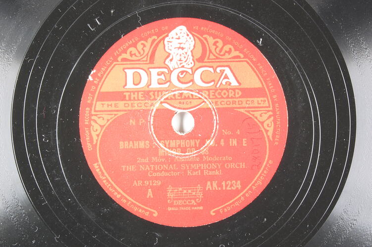 Side A: (text) / (illustration) / DECCA / THE SUPREME RECORD / THE DECCA RECORD CO. LTD. / No. 4 / BRAHMS: SYMPHONY NO. 4 IN E / MINOR, OP. 98 / 2nd Mov.: Andante Moderato / THE NATIONAL SYMPHONY ORCH. / Conductor: Karl Rankl / AR.9129 / (illustration) / AK.1234 Side B: (text) / (illustration) / DECCA / THE SUPREME RECORD / THE DECCA RECORD CO. LTD. / Recorded at / Kingsway Hall / London / No. 7 / BRAHMS: SYMPHONY NO. 4 IN E / MINOR, OP. 98 / 3rd Mov.: Allegro Giocoso (Concl.) / THE NATIONAL SYMPHONY ORCH. / Conductor: Karl Rankl / AR.9132 / (illustration) / AK.1234 One side of sleeve: Blank Second side of sleeve: Blank