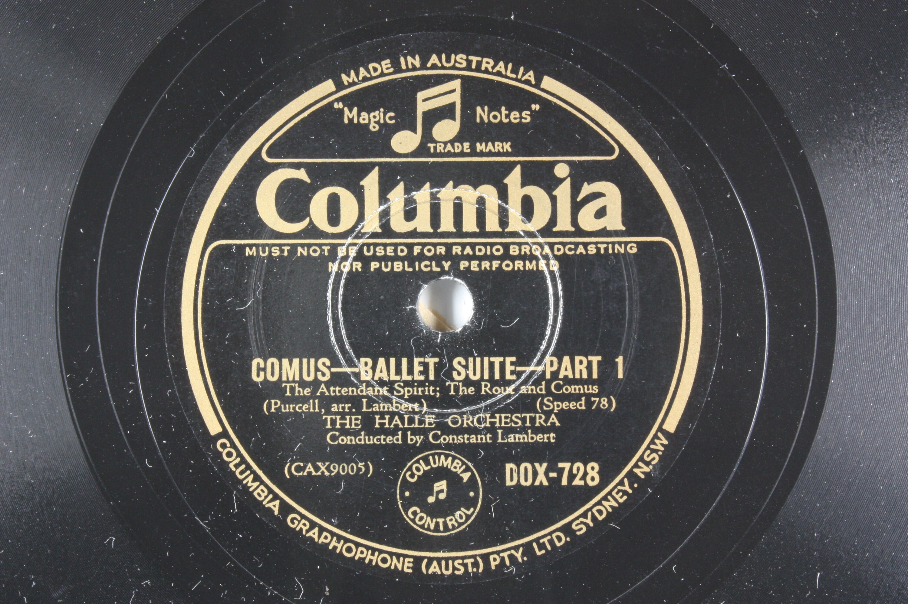 Side A: MADE IN AUSTRALIA / (text) (illustration) / COLUMBIA / (text) / COMUS-BALLET SUITE-PART 1 / The Attendant Spirit; The Rout and Comus / (Purcell, arr. Lambert) (Speed 78) / THE HALLE ORCHESTRA / Conducted by Constant Lambert / (CAX9005) (illustration) DOX-728 / COLUMBIA GRAPHOPHONE (AUST.) PTY. LTD. SYDNEY. N.S.W Side B: MADE IN AUSTRALIA / (text) (illustration) / COLUMBIA / (text) / COMUS-BALLET SUITE-PART 2 / The Lady and the Comus; The Brothers / (Purcell, arr. Lambert) (Speed 78) / THE HALLE ORCHESTRA / Conducted by Constant Lambert / (CAX9006) (illustration) DOX-728 / COLUMBIA GRAPHOPHONE (AUST.) PTY. LTD. SYDNEY. N.S.W One side of sleeve: Blank Second side of sleeve: These Records are Universal Favourites / (text) / (Patents - list of years latest 1933) / (text)