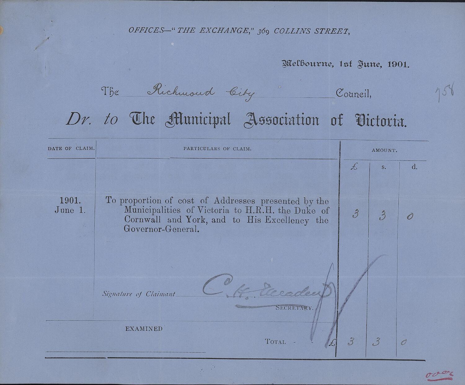 Obverse: OFFICES- " THE EXCHANGE ,' 369 Collins Street, / Melbourne, 1st June, 1901. / The [handwritten] Richmond City Council, / Dr. to the Municipal Association of Victoria. tabled: [left column]DATE OF CLAIM / 1901/ June 1 [centre column] PARTICULARS OF CLAIM./ To proportion of cost of Addresses presented by the / Municipalities of Victoria to H.R.H. the Duke of Cornwall and York, and to His Excellency the /Governor- General. /SIgnature of Claimant [stamped] C.H.Weaden/ Secretary/ EXAMINED/ TOTAL [right column] AMOUNT / £ s. d. /3:3:0/ £3:3:0 Reverse: (MEMO:- The Municipal Association has now in preparation a Volume (Royal 4to 120 pages ) containing half tone pro[illeg] reproductions of the Joint Municipal Addresses, together with copies of the signatures of all the Councillors and Municipal Clerks of the 250 Municipalities throughout Victoria by whom the Addresses were signed. The Book will also contain views of the Town Halls and Shire Halls of the various Municipal Districts of the State. / The volume will form an appropriate record of those holding Municipal Office at the date of the Inauguration of the Commonwealth, and the cost of the copy which will be forwarded to your Council as soon as it is available is included in the amount mentioned in the within account.)