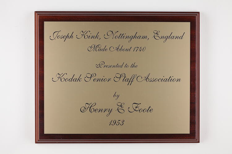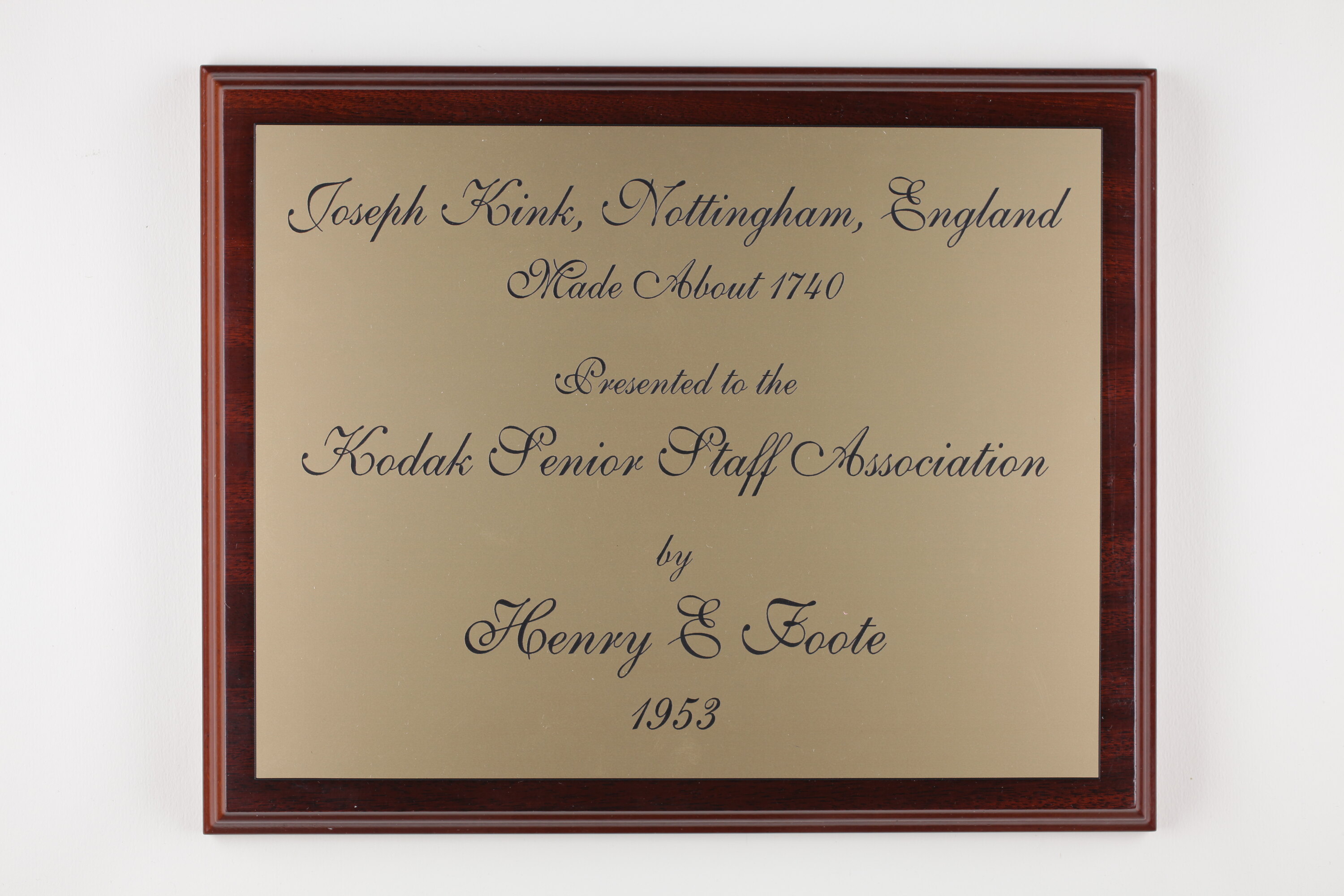 Engraved, black ink: 'Joseph Kink, Nottingham, England / Made About 1740 / Presented to the / Kodak Senior Staff Association / by / Henry E Foote / 1953'