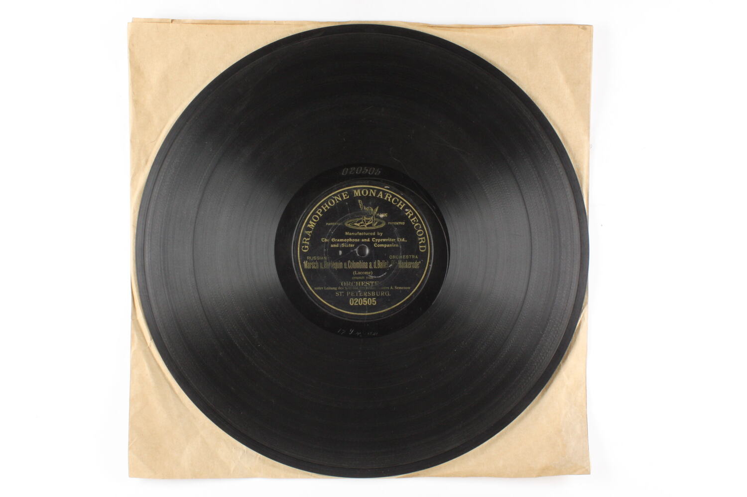 Side A: GRAMOPHONE MONARCH RECORD / (illustration) / Manufactured by / The Gramophone and Typewriter Ltd., / and Sister Companies. / RUSSIAN ORCHESTRA / "Marsch u.Harlequin u. Columbina a. D. Ballet Dio Maskerade" / (Lacome) / gespielt vour / ORCHESTRE / unter Leitung des Sollsten des Hoforetresters A. Semenow / ST. PETERSBURG. / 020505 One side of sleeve: Brunswick Record / (illustration) / (text) Second side of sleeve: Blank