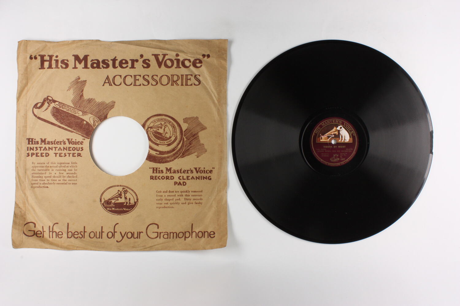 Side A: "HIS MASTER'S VOICE" / (illustration) / VIENNA BY NIGHT / FIRST RECORD (KOMLAK) / MAREK WEBER AND HIS ORCHESTRA / ORCHESTRA (4-040606) / (illustration) / Speed 78 Cat. No. C. 1507 / Record manufactured by THE GRAMOPHONE CO. LTD., Sydney, N.S.W. Side B: "HIS MASTER'S VOICE" / (illustration) / VIENNA BY NIGHT / FIRST RECORD (KOMLAK) / MAREK WEBER AND HIS ORCHESTRA / ORCHESTRA (4-040607) / (illustration) / Speed 78 Cat. No. C. 1507 / Record manufactured by THE GRAMOPHONE CO. LTD., Sydney, N.S.W. One side of sleeve: "His Master's Voice" / ACCESSORIES / (illustration) / (text) Second side of sleeve: (text) / (illustration) / (text)