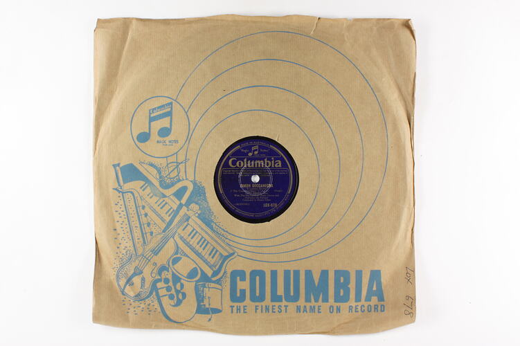 Side A: "MADE IN AUSTRALIA" / COLUMBIA / DON GIOVANNI / SERENADE - With Metropolitan Opera Ochestra; / CHAMPAGNE ARIA - With Piano / (Mozart) (Speed 78) / EZIO PINZA / Bass (In Italian) / (XCO37362) / LOX-678 / FOR COLUMBIA GRAPHOPHONE (AUST.) PTY. LTD. SYDNEY. N.S.W Side B: "MADE IN AUSTRALIA" / COLUMBIA / SIMON BOCCANEGRA / "Il Lacerato Spiriito" / ("The Tormented Spirit) (Act 1) (Verdi) / EZIO PINZA / Bass / With Metropolitan Opera Chorus and Orchestra / (In Italian) / Conducted by Fausto Cleva / (XCO35592) / LOX-678 / FOR COLUMBIA GRAPHOPHONE (AUST.) PTY. LTD. SYDNEY. N.S.W One side of sleeve: COLUMBIA / (text and illustrations). Second side of sleeve: (text)