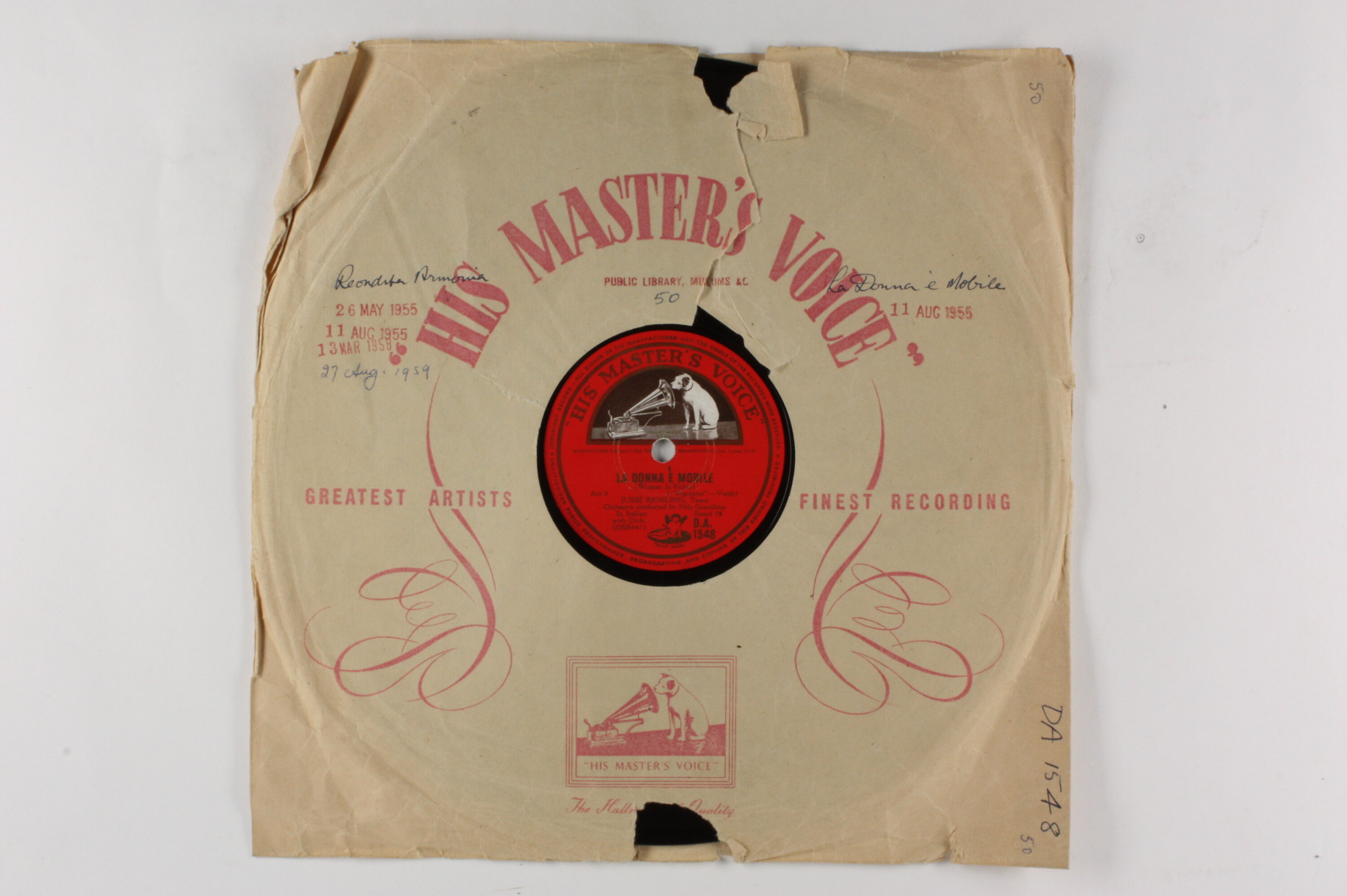 Side A: "HIS MASTER'S VOICE" / LA DONNA É MOBILE / (Woman is Fickle) / Act 3 ("Rigoletto" - Verdi) / JUSSI BJORLING / Tenor / Orchestra conducted by Nils Grevillius / In Italian with Orch. / (OSB441) / Speed 78 / D.A 1548 Side B: "HIS MASTER'S VOICE" / Recondita ARMONIA' / (Strange Harmony) / Act 1 ("Tosca" - Puccini) / JUSSI BJORLING / Tenor / Orchestra conducted by Nils Grevillius / BIEM / In Italian with Orch. / (OSB442) / Speed 78 / D.A 1548 One side of sleeve: HIS MASTER'S VOICE / (text and illustrations) Second side of sleeve: (text and illustrations)