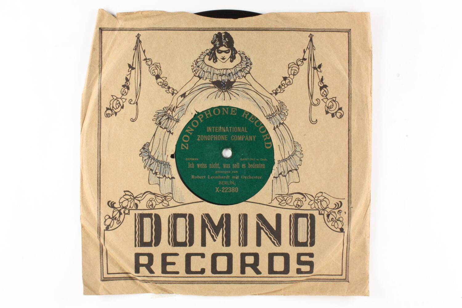 Side A: ZONOPHONE RECORD / INTERNATIONAL ZONOPHONE COMPANY / GERMAN / BARITONE w. Orch. / Ich weiss nicht, was sol les bedeuten / gesungen von / Robedrt Leonardt mit Orchester / BERLIN / X-22380 Side B: ZONOPHONE RECORD / INTERNATIONAL ZONOPHONE COMPANY / GERMAN / BARITONE with Orch. / Ihr heisset mich willkommen / aus ,,Der Trompeter von Sackingen / gesungen von / Robert Loeonhardt mit Orchester / BERLIN / X-22381 One Side Of Sleeve: Domino (text and illustrations) Second Side of Sleeve: blank