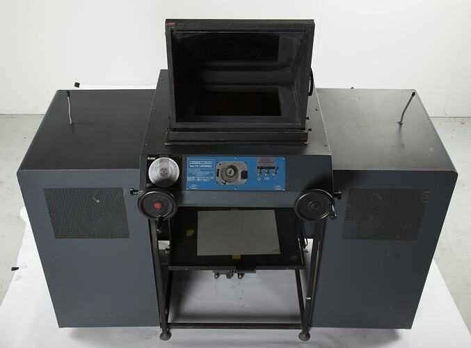 This is the left-hand light cover from the Littlejohn Graphic Systems Ltd 'Copyspeed Type 170' process camera. The light covers, placed either side of the main camera unit, were designed to house the 750 watt tungsten lamps, but they also hand rubber-tipped fixtures on top, used as rests for camera components when they were hinged open.