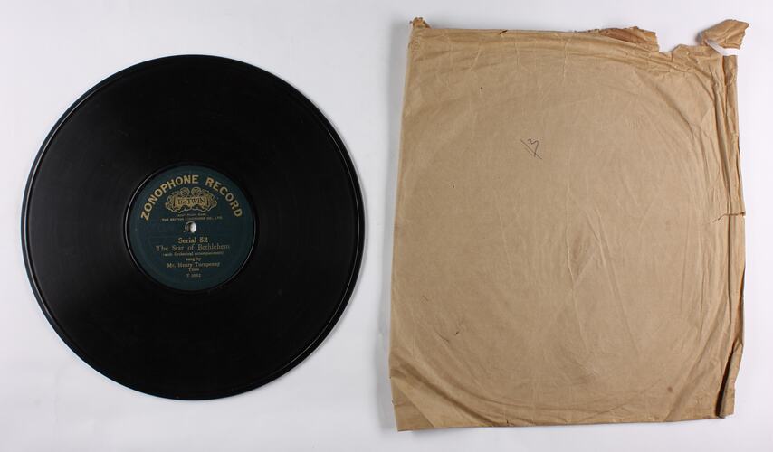 10 inch doble-sided disc. Contents: ""The Star of Bethlehem" & "The Holy City", with orchestral accompaniment sunf by Mr. Henry Turnpenny, tenor. Manufactured by the British Zonphone Co. Ltd.