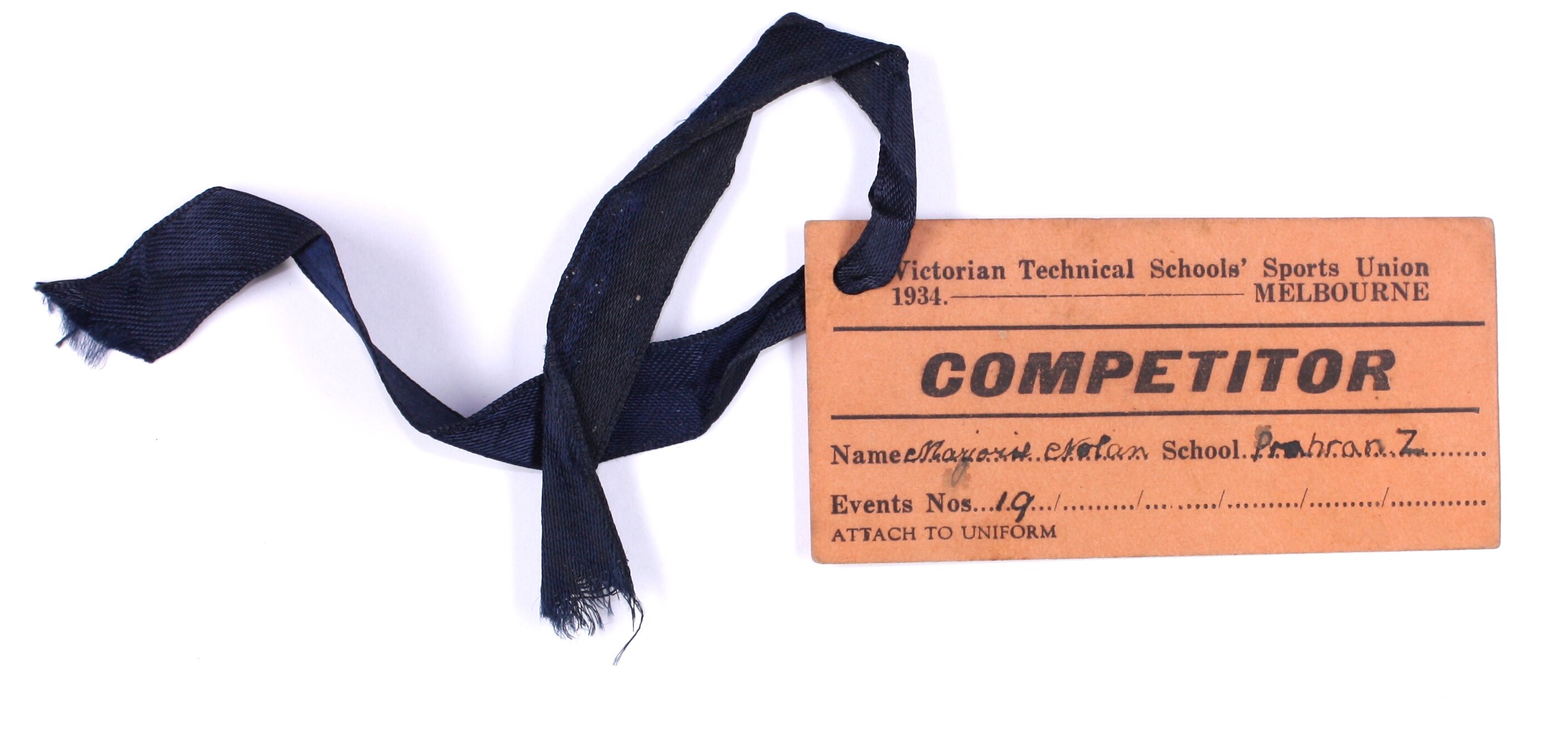 Printed on obverse with handwritten information in black ink: Victorian Technical Schools, Sports Union/ 1934. MELBOURNE/ COMPETITOR/ Name Marjorie Nolan School Prahran Z/ Events Nos 19/; ATTACH TO UNIFORM Printed on reverse: Competitors must be at the starting post/ on Time and retire from arena immediately/ their event is completed.