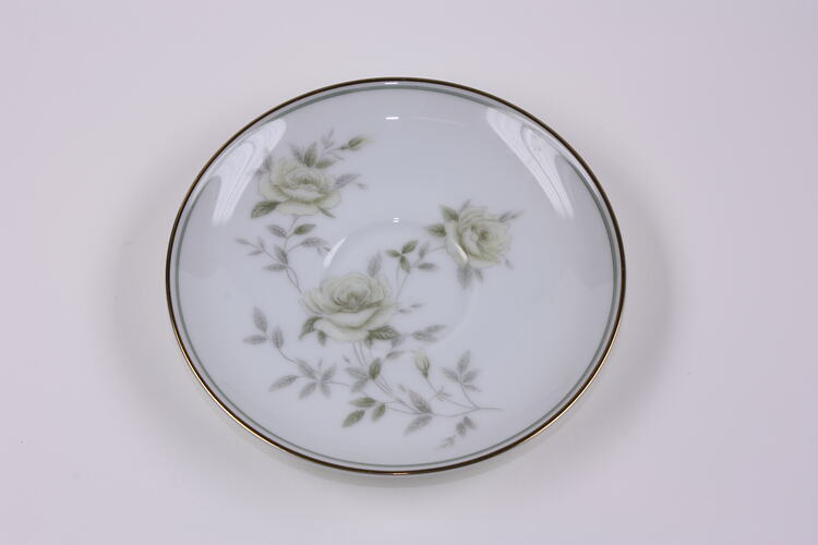 Saucer for an espresso size coffee cup, part of a fifteen piece Noritake china coffee set, received by Dorothea Dunzinger in Melbourne as a wedding gift in 1960 soon after migrating from Austria in 1959. It is white china with a pale grey and yellow rose design and consists of six cups, saucers, a milk jug, sugar bowl and coffee pot.