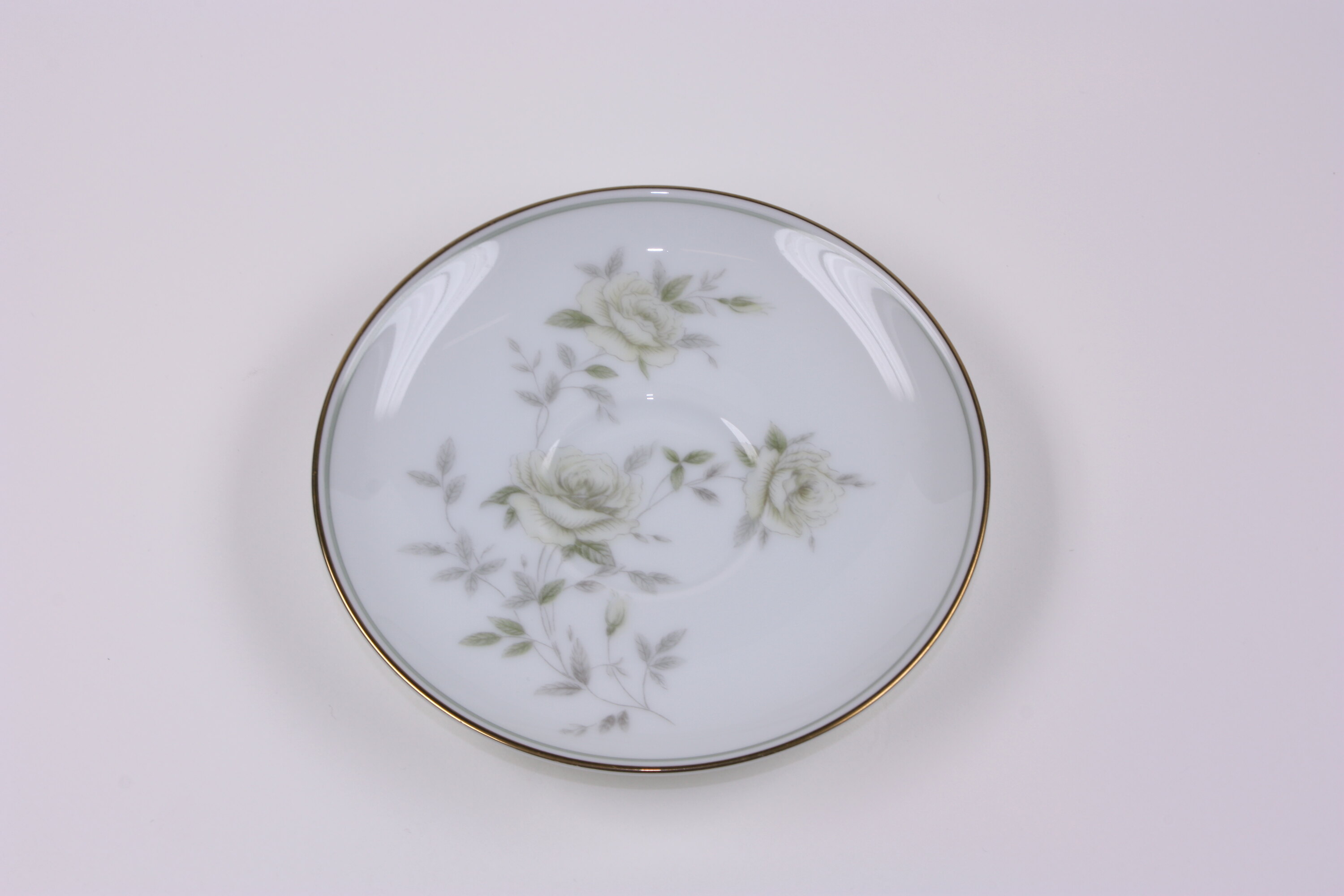 Noritake china saucer. It is white china with a pale grey and yellow rose design with gold edging. The saucer has a hallmark on the base, blue and gold with a central 'N'.