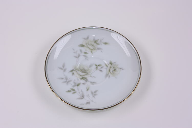 Saucer for an espresso size coffee cup, part of a fifteen piece Noritake china coffee set, received by Dorothea Dunzinger in Melbourne as a wedding gift in 1960 soon after migrating from Austria in 1959. It is white china with a pale grey and yellow rose design and consists of six cups, saucers, a milk jug, sugar bowl and coffee pot.