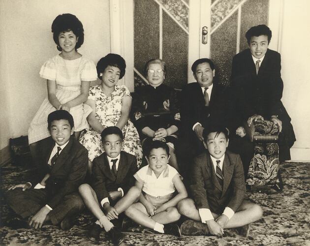 Photograph of the Gung family at Mary and Samuel Gung's family home at 24 Madura Street Ascot Vale, Melbourne, circa 1965. The family are wearing formal clothes and would have been on their way to or from church. From left to right: [back row] Phyllis Louey Gung [eldest daughter), Mary Louey Gung (mother), grandmother Louey Gung (who lived nearby), Samuel Louey Gung (father), Jeffrey Louey Gung (second eldest son]; [front row] David Louey Gung [third eldest son], Martin Louey Gung [fifth eldest son], Colin Loey Gung [youngest son], Leslie Louey Gung [fourth eldest son]. The photograph was taken by relative Phillip Louey Gung.