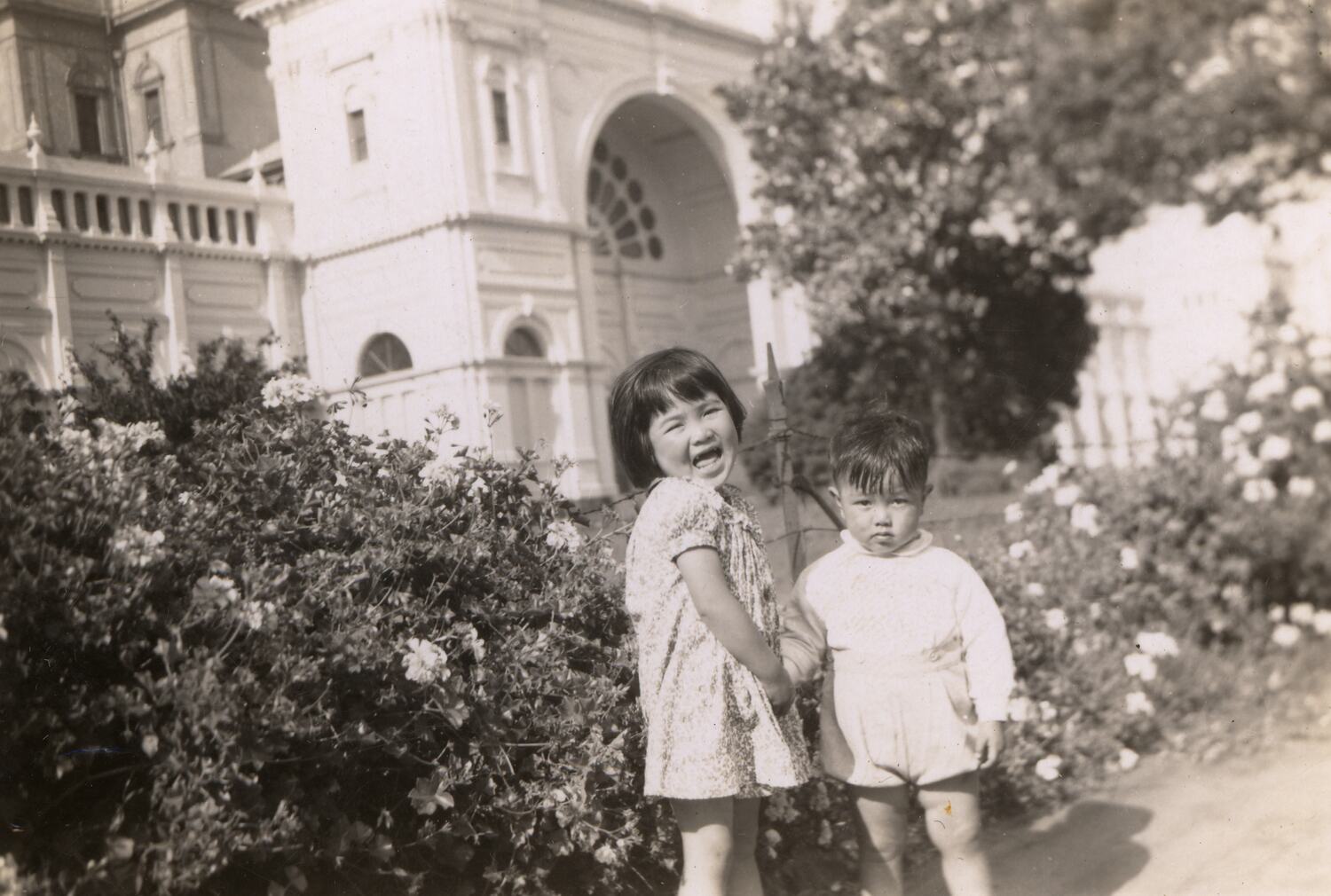 Photograph of Phyllis & Jeffrey Louey Gung outside the Royal Exhibition Building, Carlton Gardens, Melbourne, circa 1948.