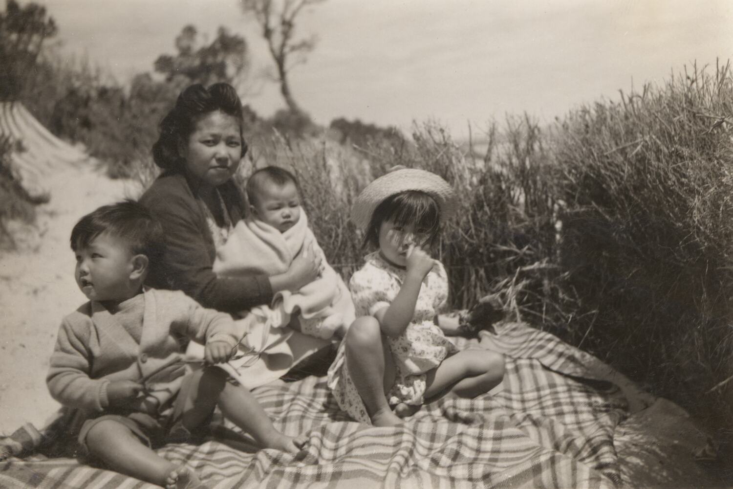 Woman with three young children sitting on a blacket on sand dunes at a beach.