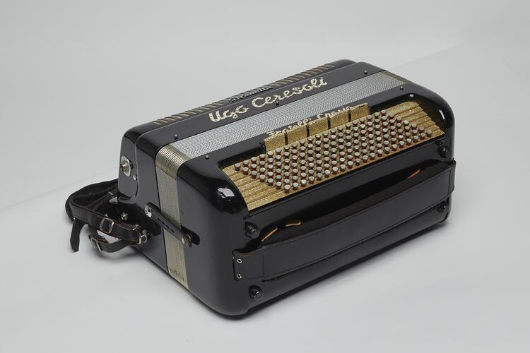 Button accordion with case, belonging to Ugo Ceresoli. The accordion was manufactured by Fratelli Crosio, Stradella, Lombardy, Italy. Possibly bought to Australia by Ugo Ceresoli when he arrived in 1952.