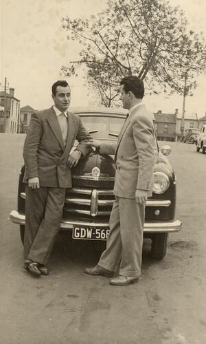 Digital photograph of Bruno Ceresoli [left] and his brother Ugo Ceresoli pictured alongside Ugo's Vauxhall Velox automobile in Palmerston Street Carlton where they rented accommodation.