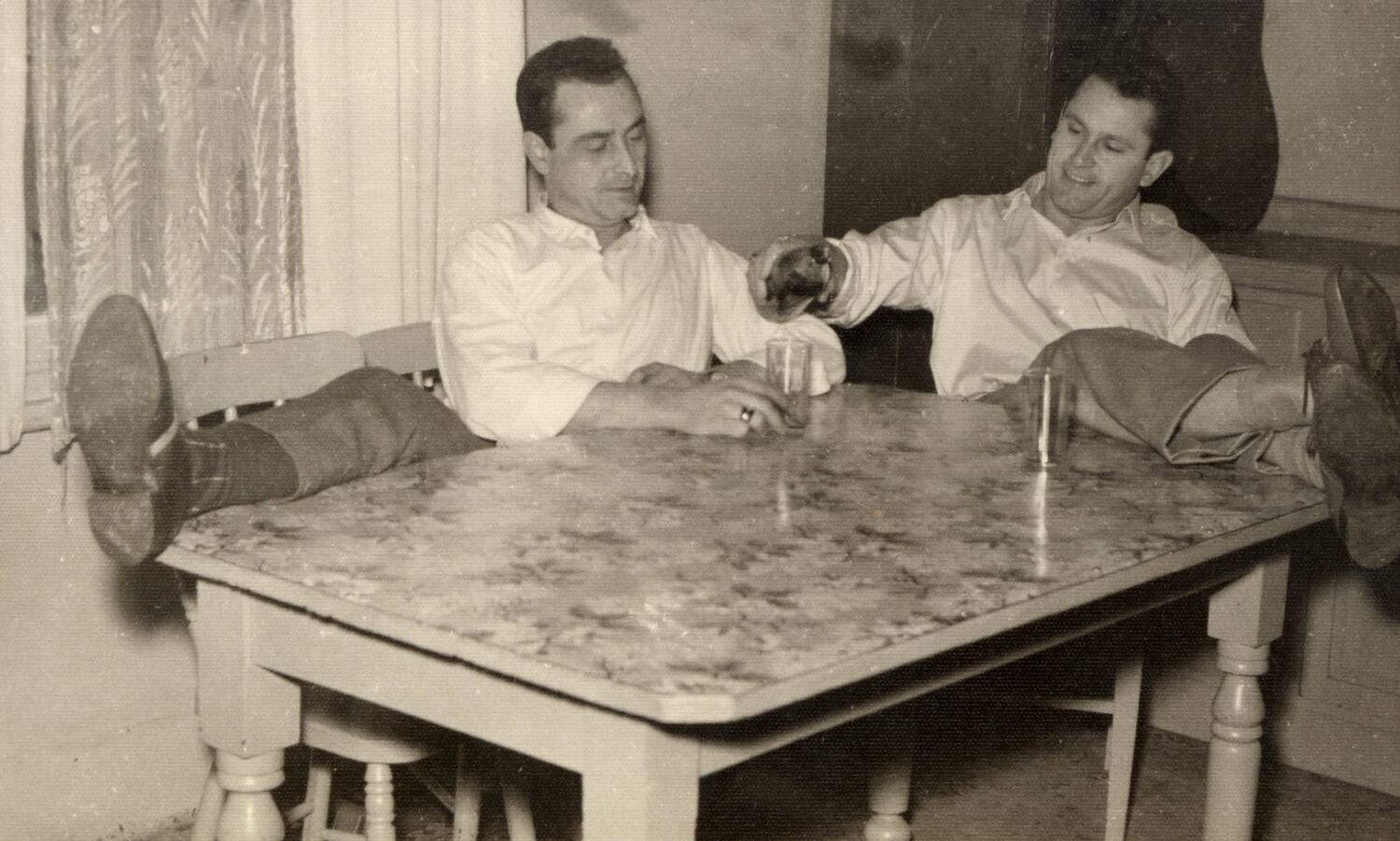 Digital photograph of Bruno Ceresoli [left] and his brother Ugo Ceresoli enjoying a drink at 230 Palmerston Street Carlton where they rented accommodation, in 1953. Ugo Ceresoli describes themselves on the back of the photograph as being 'Americani!'