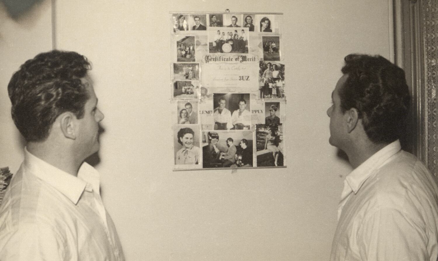 Digital photograph of Ugo Ceresoli [left] and his brother Bruno Ceresoli in their rented apartment, looking at family photos and a publicity poster for their appearance on 3UZ Radio Station [original certificate contained in item HT35921].