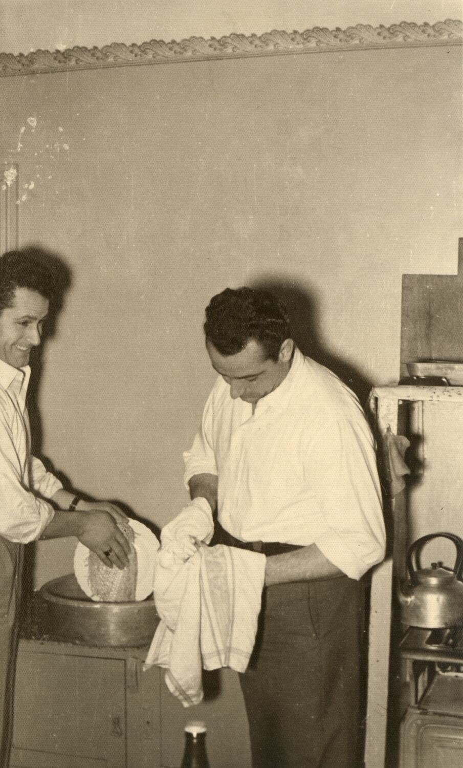Digital photograph of Ugo Ceresoli [left] and his brother Bruno Ceresoli washing-up in the kitchen of the boarding house at 230 Palmerston Street, Carlton, where they rented accommodation. The house was owned and rented out by Attilio Harcon [?].