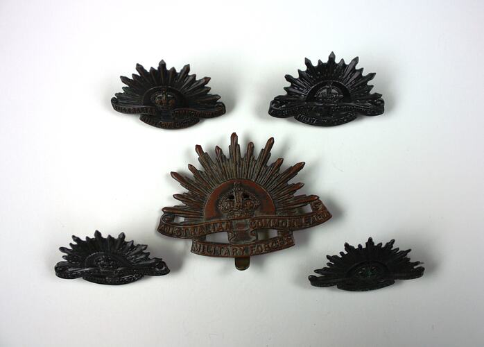 Five pressed metal badges, bronze colour. Rising Sun motif, with sun-rays around upper half, semi-circle in centre containing crown, and double-banner at bottom containing inscription. Three of the smaller badges have two lugs on the back; the fourth smaller badge has a horizontal hinged pin. The larger badge has a vertical brass clip in the back, slightly bent at the end.