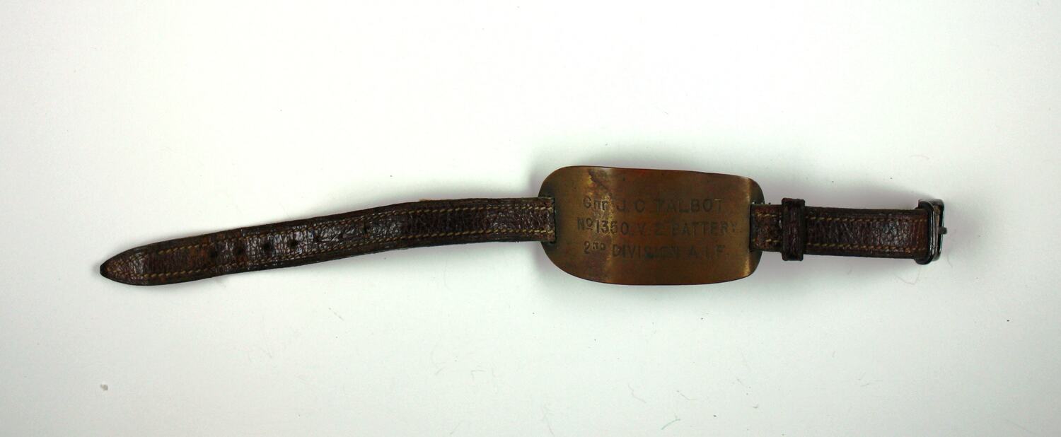Identity bracelet, copper on leather strap. Part of a collection of material associated with the World War I service of Gunner James Clive Talbot. Talbot is likely to have been wearing the bracelet when he died. It has a slight dent, perhaps from battle damage.