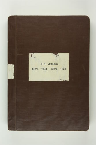 Front cover, typed, black ink: 'H.O. JOURNAL / SEPT. 1928 - SEPT. 1930'