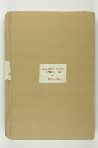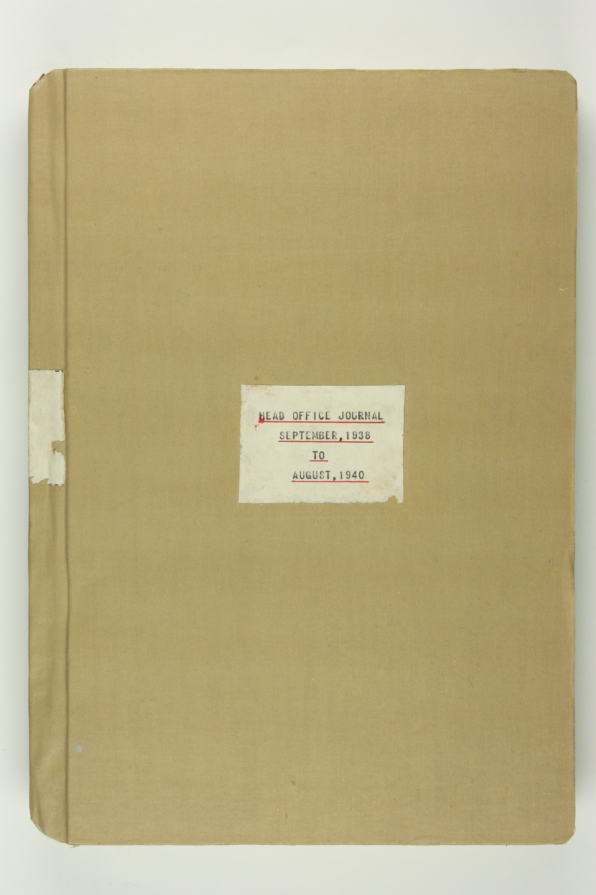 Front cover, typed, black ink: 'HEAD OFFICE JOURNAL / SEPTEMBER, 1938 / TO / AUGUST 1940.'