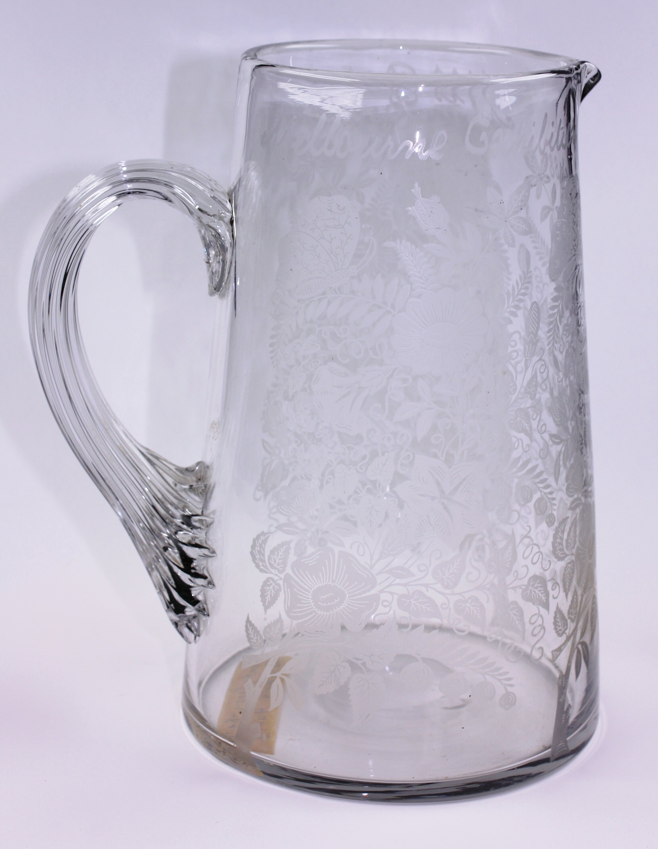 Tapering cylindrical, clear glass jug with reeded-loop handle, engraved all-over with a pattern of flowers, leaves and butterflies. Engraved around the rim with text. Sticker attached to the base by donor's family.