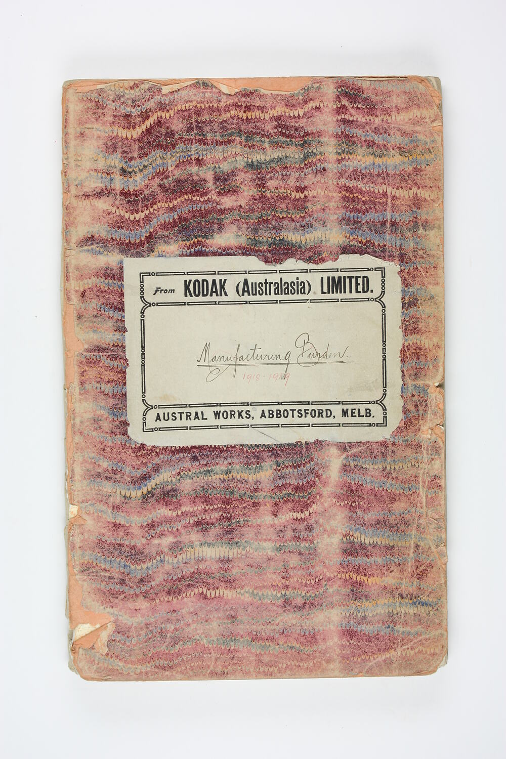 Front cover, printed and handwritten, black ink: 'from KODAK (Australasia) LIMITED. / Manufacturing Burden / AUSTRAL WORKS, ABBOTSFORD, MELB.'