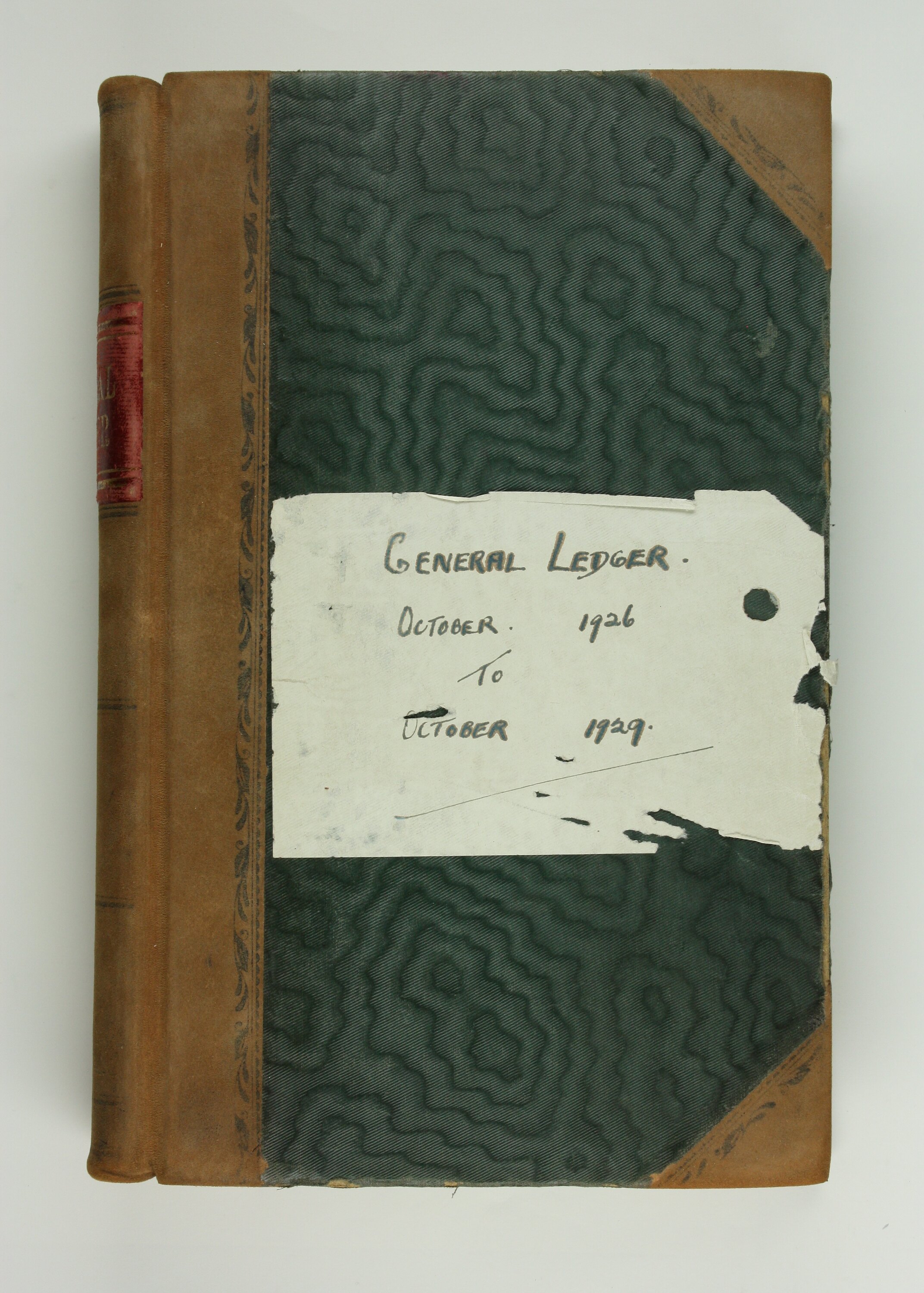 Label, front cover, handwritten, black ink: 'GENERAL LEDGER. / OCTOBER. 1926 / To / OCTOBER 1929.'