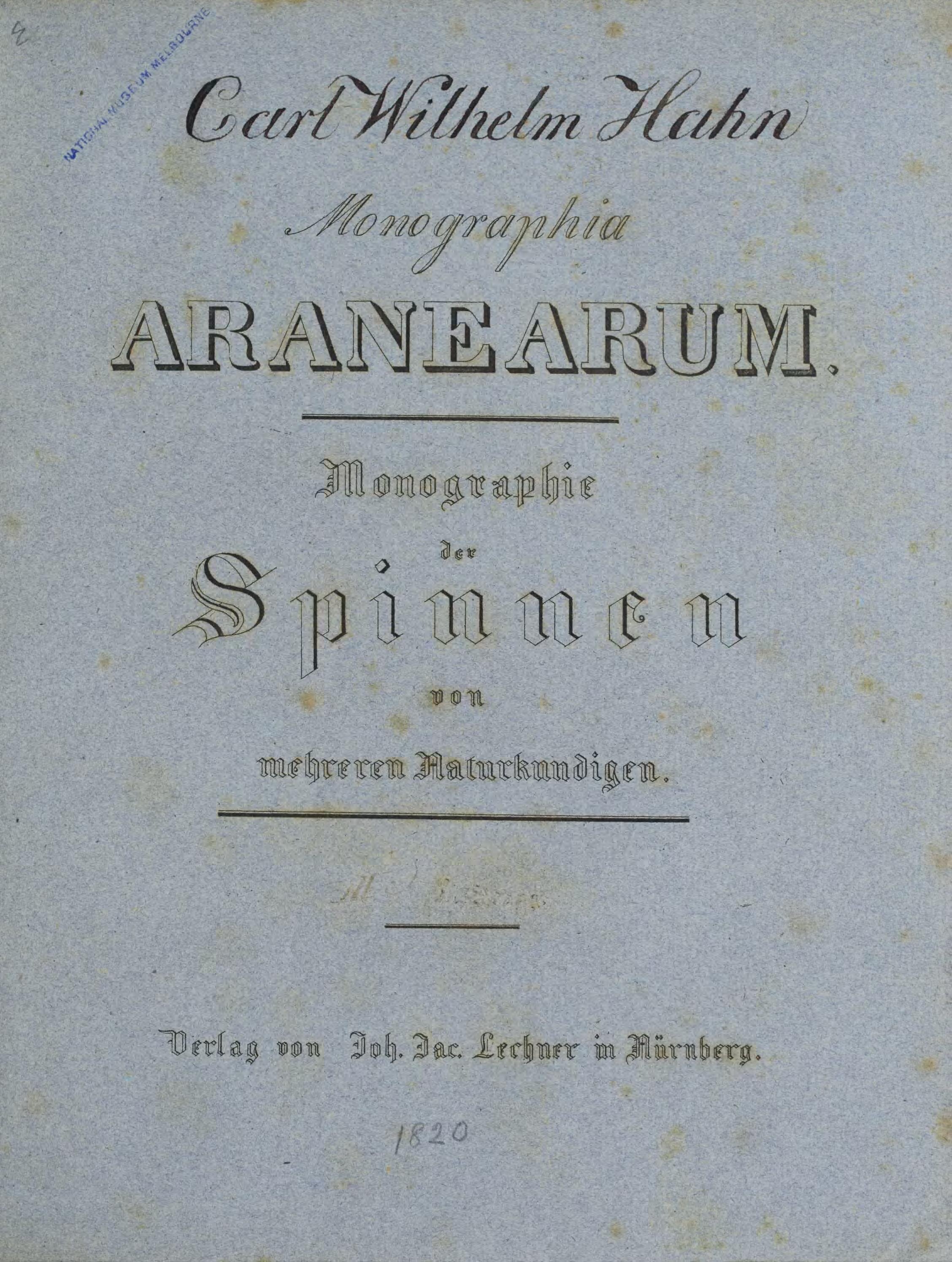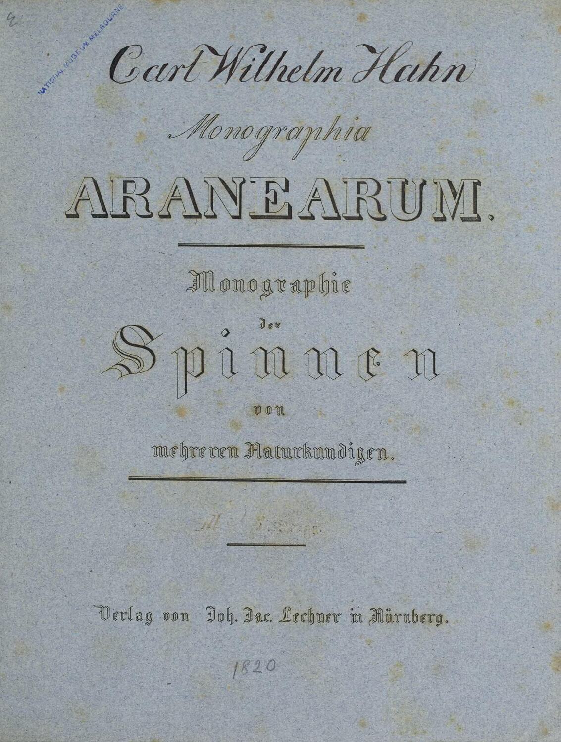 'Monographia Aranearum' was published in Nuremberg by Lechner 1820-1836. Hahn planned to publish twelve parts in monthly instalments. Each part was to include four plates, with the twelfth instalment to comprise a detailed text. In the end, only eight parts were produced over a period of sixteen years. Hahn ceased his editorial role in the work after the fifth instalment, due to a dispute with Lechner. The following instalments are still thought to be Hahn's work, although the material was used without his consent.