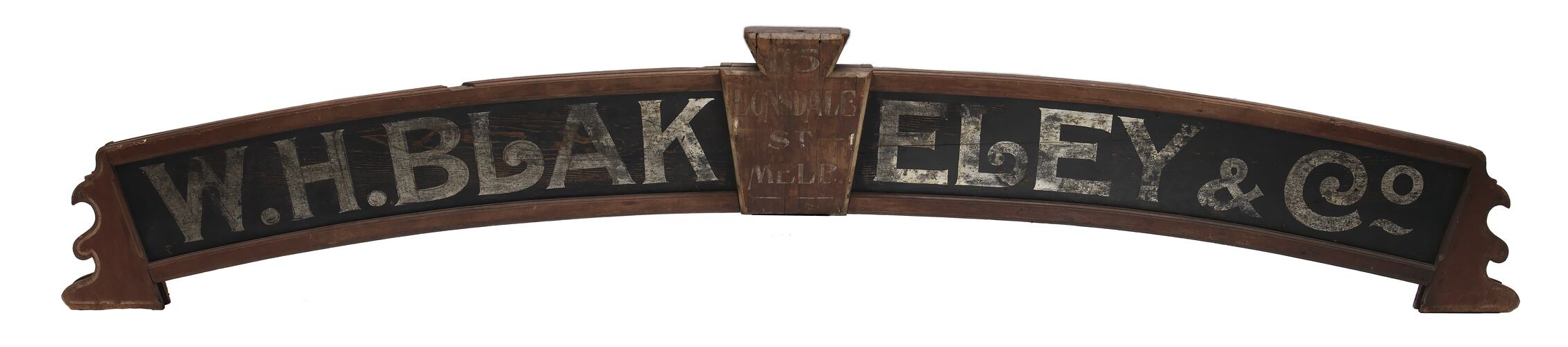 Wooden sign painted with the trade name of "WH Blakeley & Co".