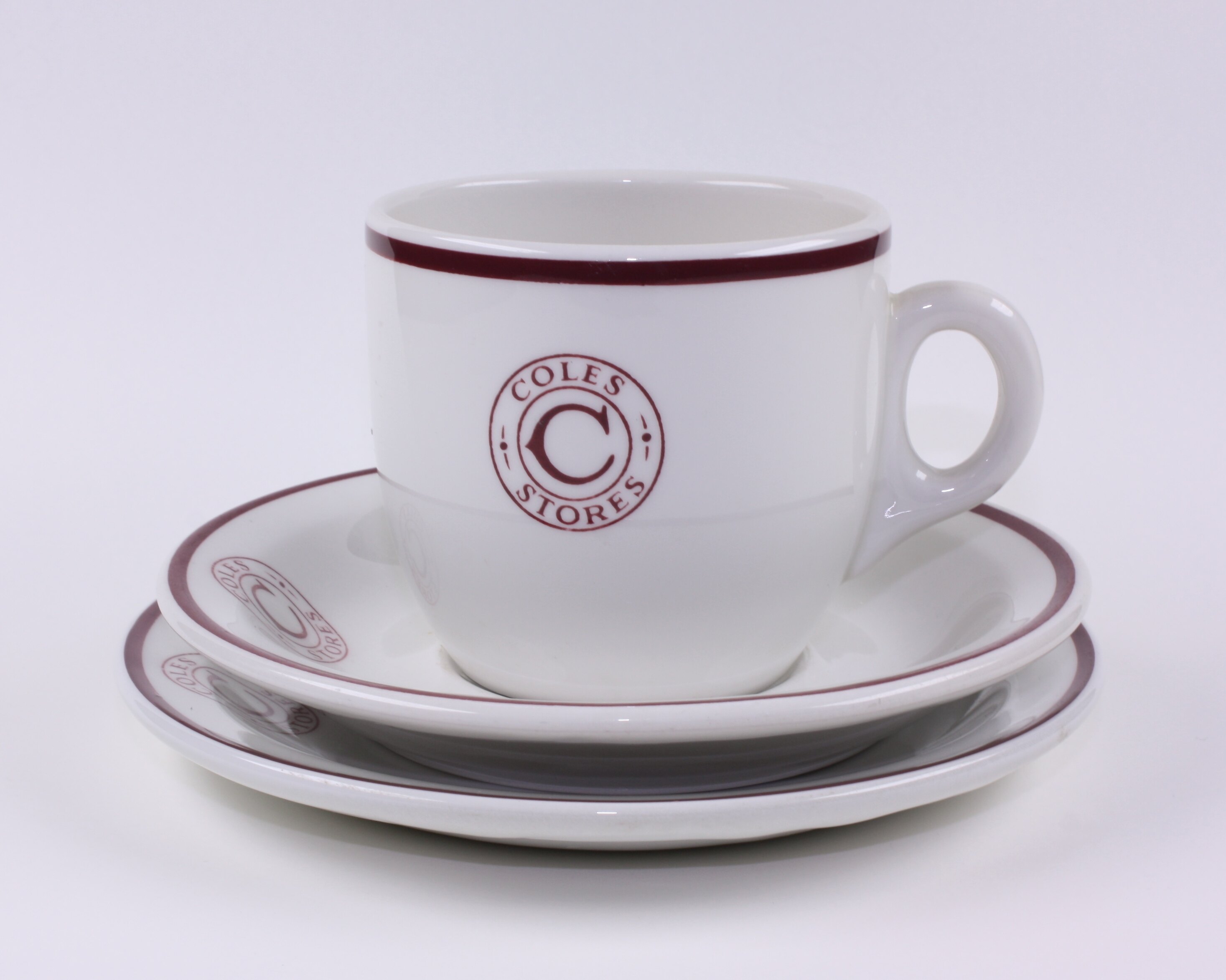 Printed on front of cup, saucer and plate: 'COLES/ C/ STORES' Printed on back of cup, saucer and plate: 'Bristile/ HOTEL CHINA/ VITRIFIED/ made in/ AUSTRALIA'