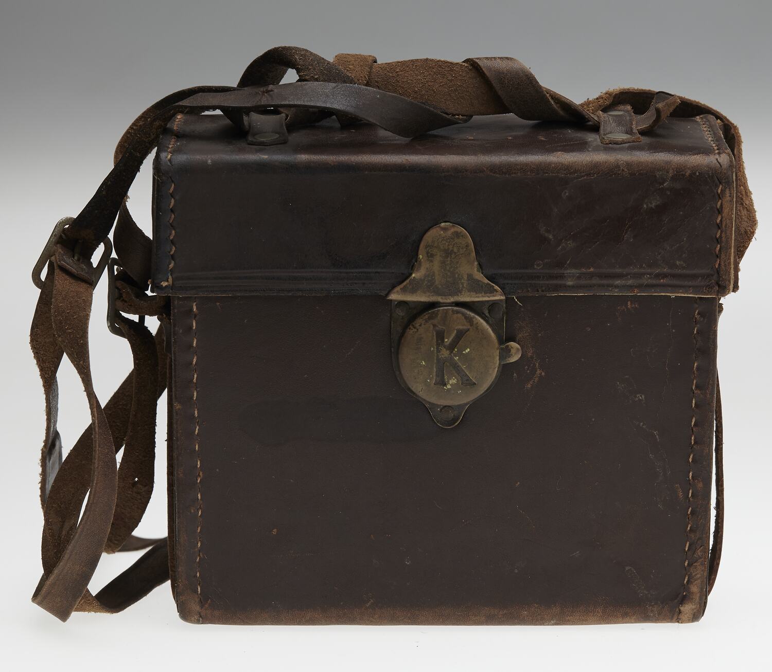 Reinforced leather carry bag with brass lock engraved with the letter 'K'. Bag features adjustable leather shoulder strap, and is lined with red buckram.