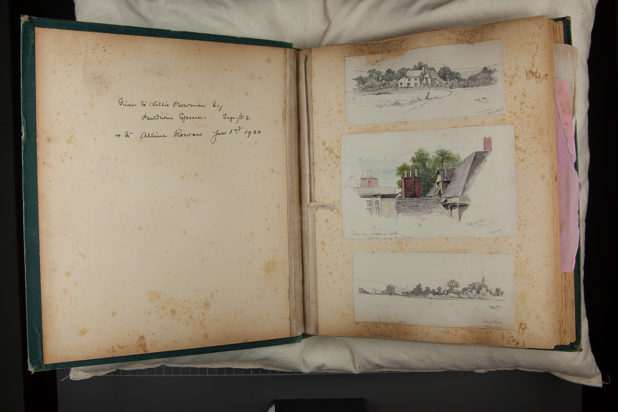 This sketch book belonged to Walter Baldwin Spencer during part of his time at Exeter College, Oxford. It includes sketches from around Oxford and views from the college but much of the works are a record of his travels through Europe. The album was given to Lillie Bowman whom he later married, Mary Elizabeth Spencer. A few years after Spencer's death it was given to his daughter Alline in Jan 1930.