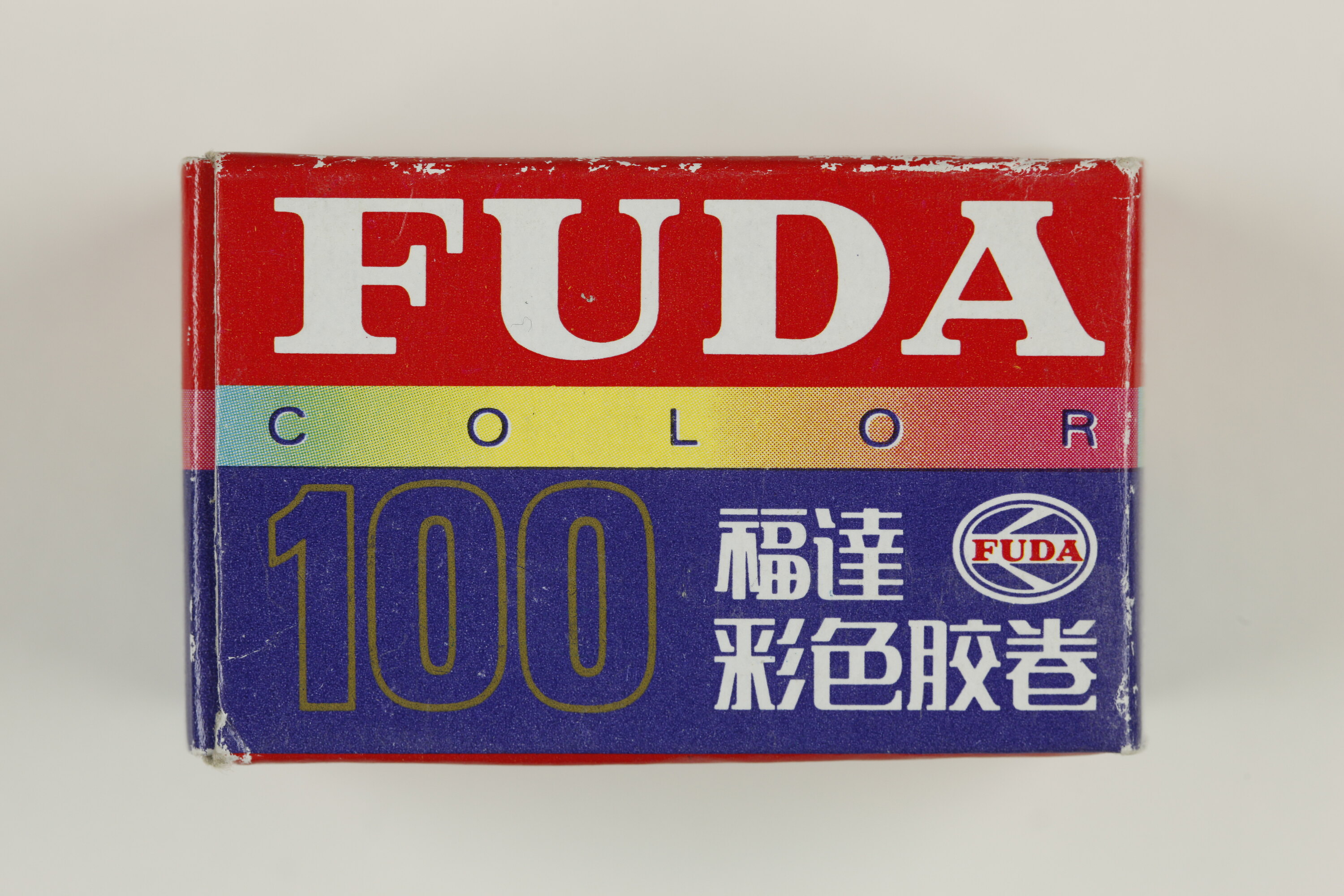 Fuda Color film cartridge, ASA 100 speed in original cardboard carton. This film was made in China by Xiamen Photographic Materials Company Limited (XPMC), who were under license from Eastman Kodak Company to produce colour film. Steve Brain, the donor, worked with XPMC to help establish the colour film processing in China.