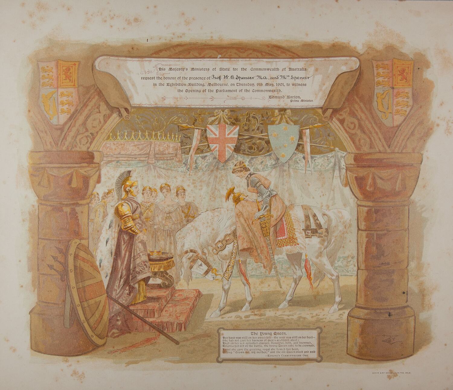 Coloured invitation to Prof WB Spencer MA and Mrs Spencer to witness the opening of the Parliament of the Commonwealth by the Prime Minister Edmund Barton on 9 May 1901.