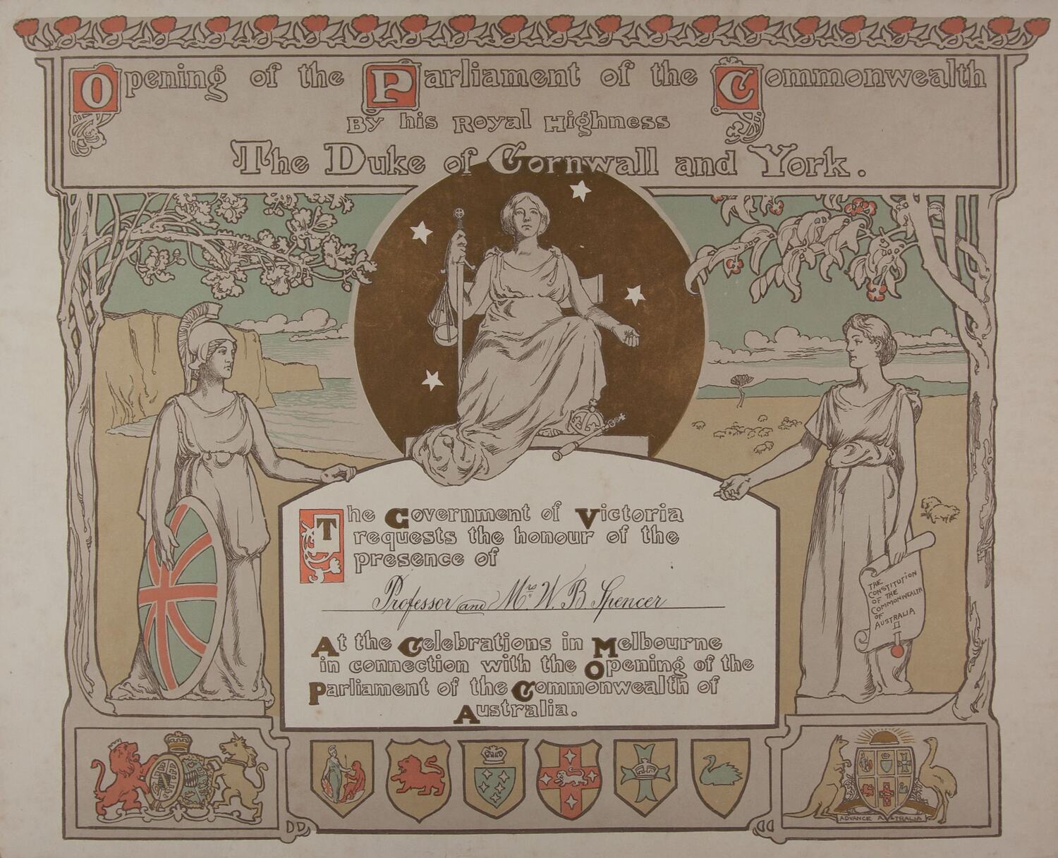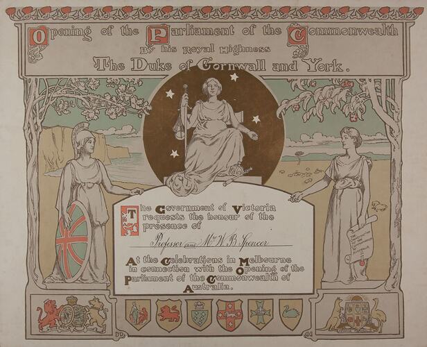 Printed: Opening of the Parliament of the Commonwealth/ by his Royal Highness/ The Duke of Cornwall and York.; The Government of Victoria/ requests the honour of the/ presence of .../At the Celebrations in Melbourne/ in connection with the Opening of the/ Parliament of the Commonwealth of/ Australia. Handwritten on the dotted line: Professor and Mrs WB Spencer