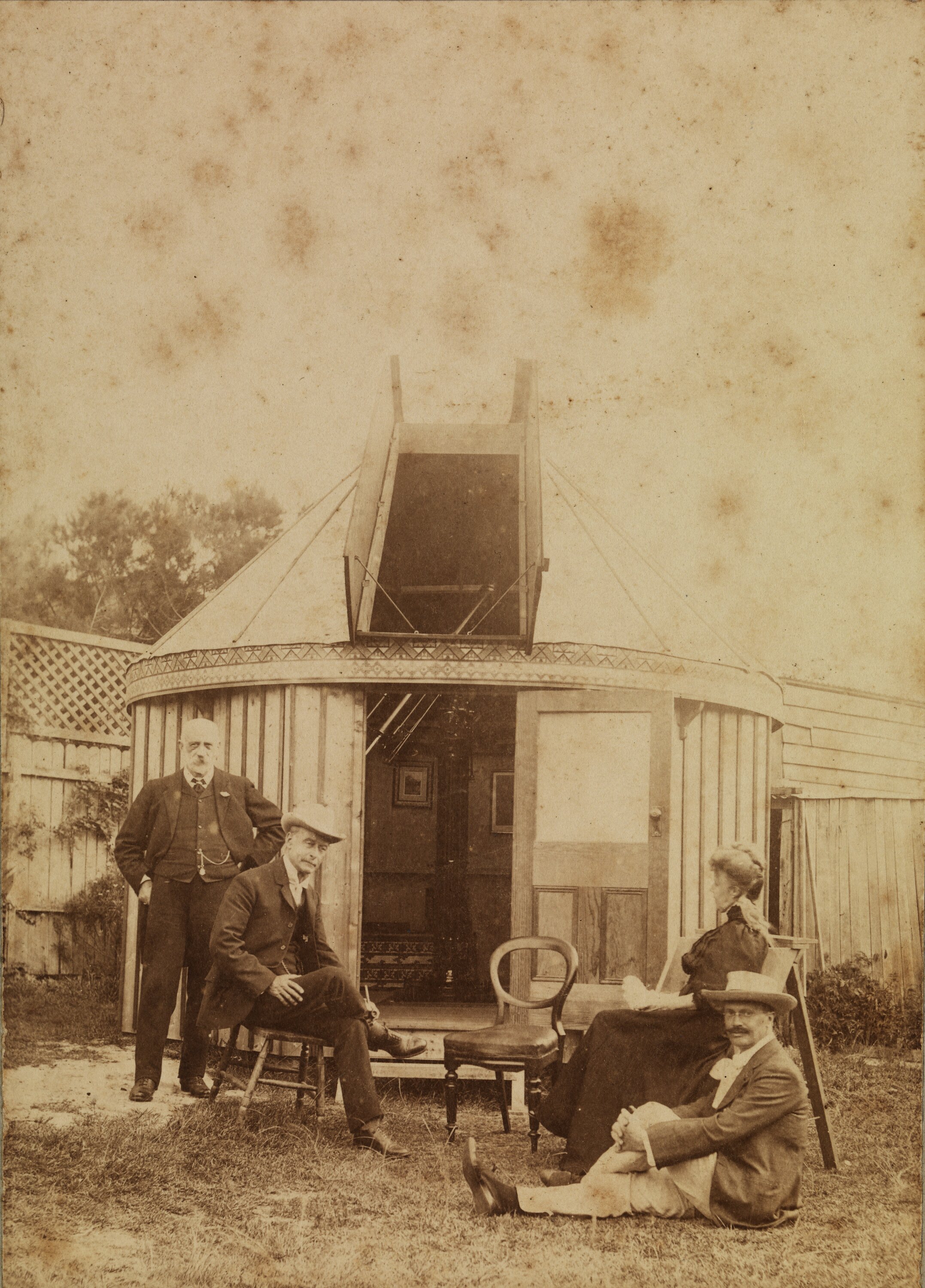 Group of four people sitting and standing in front of a backyard observatory. People from left to right are: William John Macdonnell; George Denton Hirst, amateur astronomer and close friend of Macdonnell; Emily Macdonnell (nee Goddard), Macdonnel's wife, who assisted in his observations; third male unidentified.