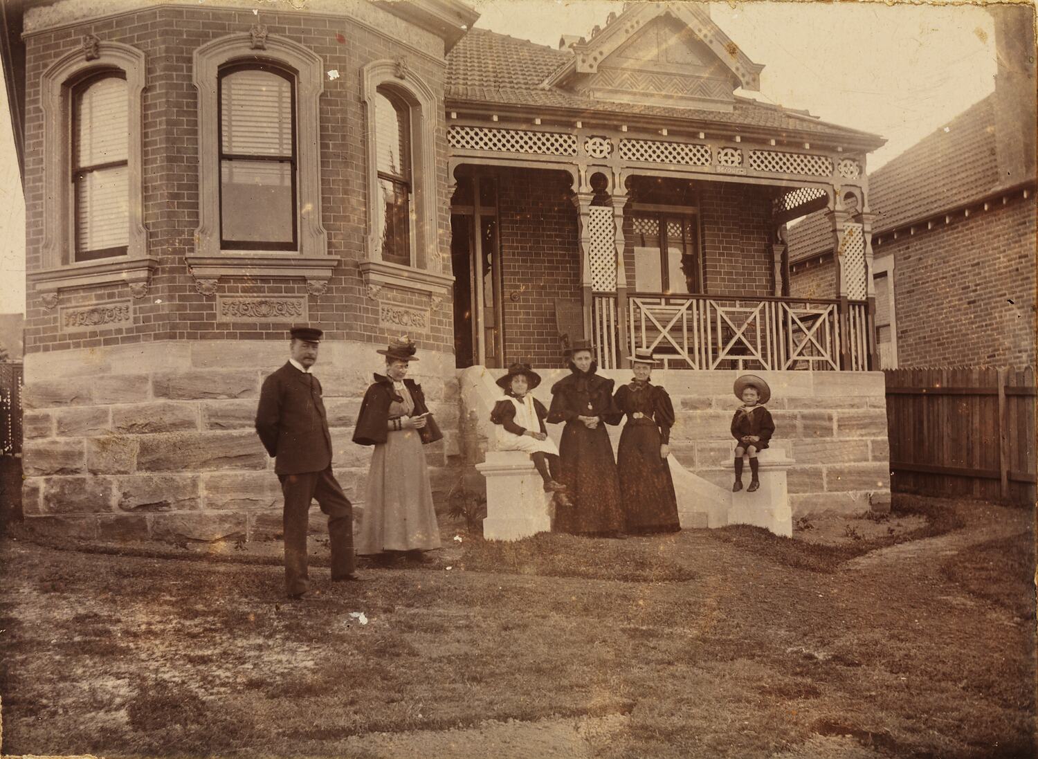 George Denton Hirst (1846-1915), standing with his family at the front of his home at 28 Muston Street, Mosman, New South Wales, May 1898.