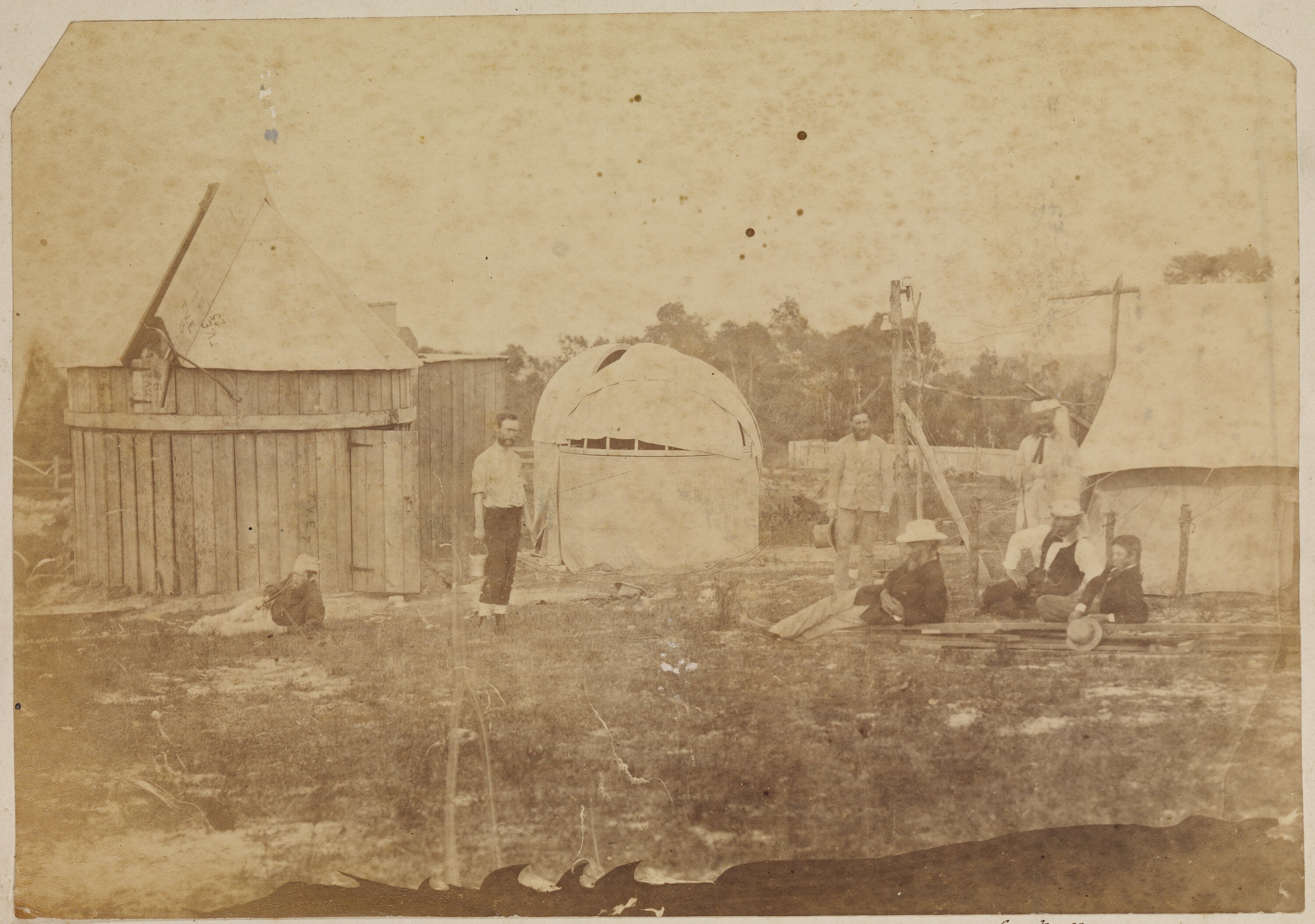 View of the Transit of Venus camp looking east. People from left to right are: L. Abington Vessey, sitting in front of the Photoheliograph hut; George Denton Hirst, standing in front of transit dome; Newman (standing) and Philip Francis Adams (lying); Cracknell (standing), Alfred Fairfax (seated); telegraph operator (lying).