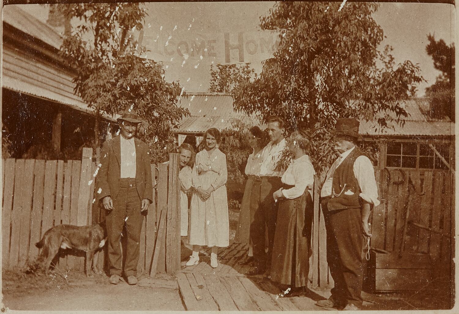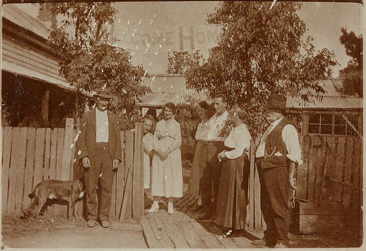 Digital copy of original photograph taken at rear of The Uplands. To the left is the bedroom wing, behind the group are the living rooms. A painted sheet is suspended in the trees with the words 'Welcome Home''; bunting along the edge of the verandah has a union jack with 'Welcome' printed.