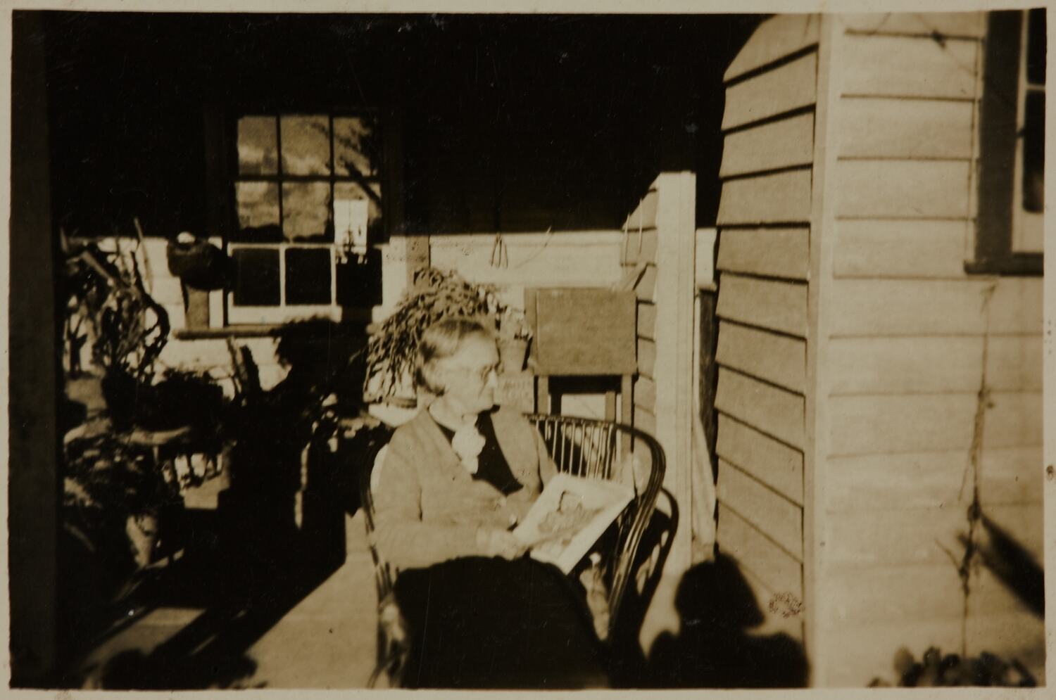 Digital copy of original photograph of Elizabeth Lawrey on the verandah of The Uplands, circa 1920s.