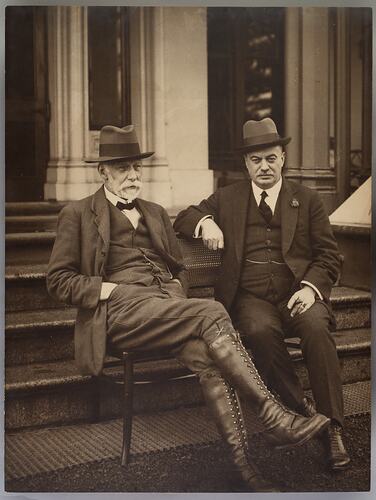 Two men in suits, waistcoats and hats sit on a bench outside, in front of the stone steps of a grand building. The man at left has high, button boots, jodhpurs, a bow tie, hat, fob watch and white beard. His legs are crossed. The man to his right is in a dark suit and bowler hat with a fob watch and a flower corsage on his suit jacket. He wears a ring, and has a cigar in his left hand.