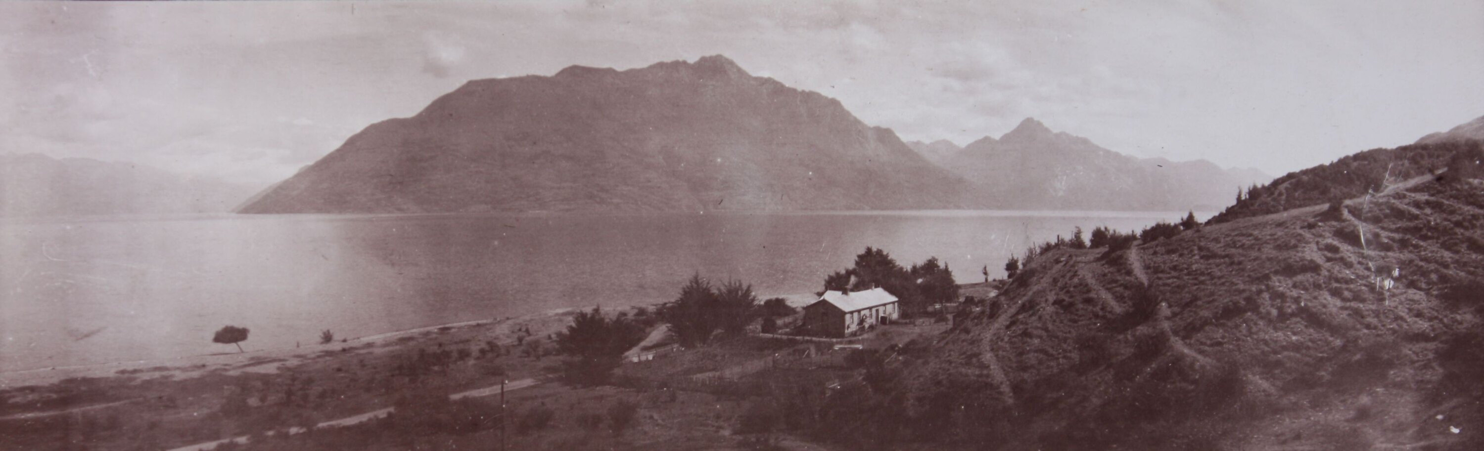 Buuilding in foreground on foreshore of lake with undulating land rising to the right of image and mountains on opposite side of lake in background.