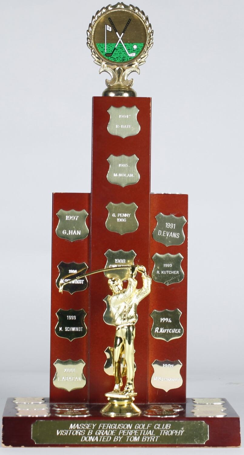 Engraved on plate at the bottom of the trophy: 'MASSEY FERGUSON GOLF CLUB / VISITORS B GRADE PERPETUAL TROPHY / DONATED BY TOM BYRT'