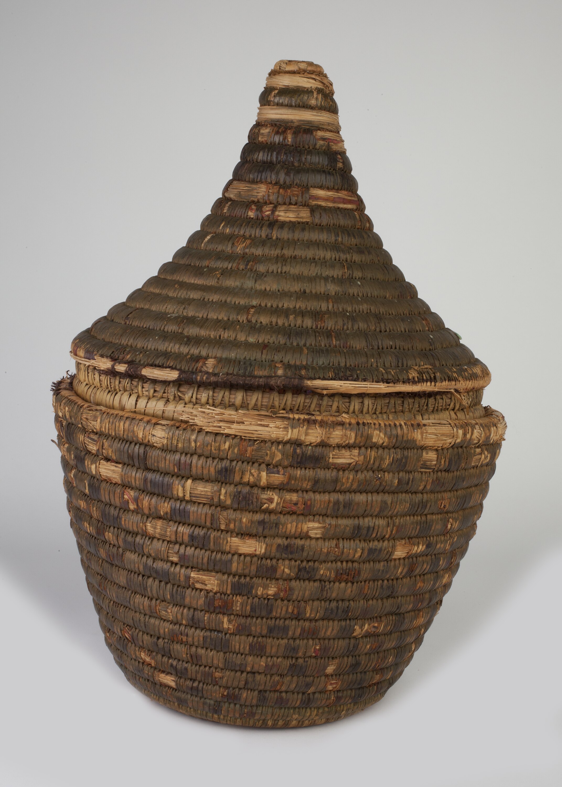Woven fibre basket and conical-shaped lid.