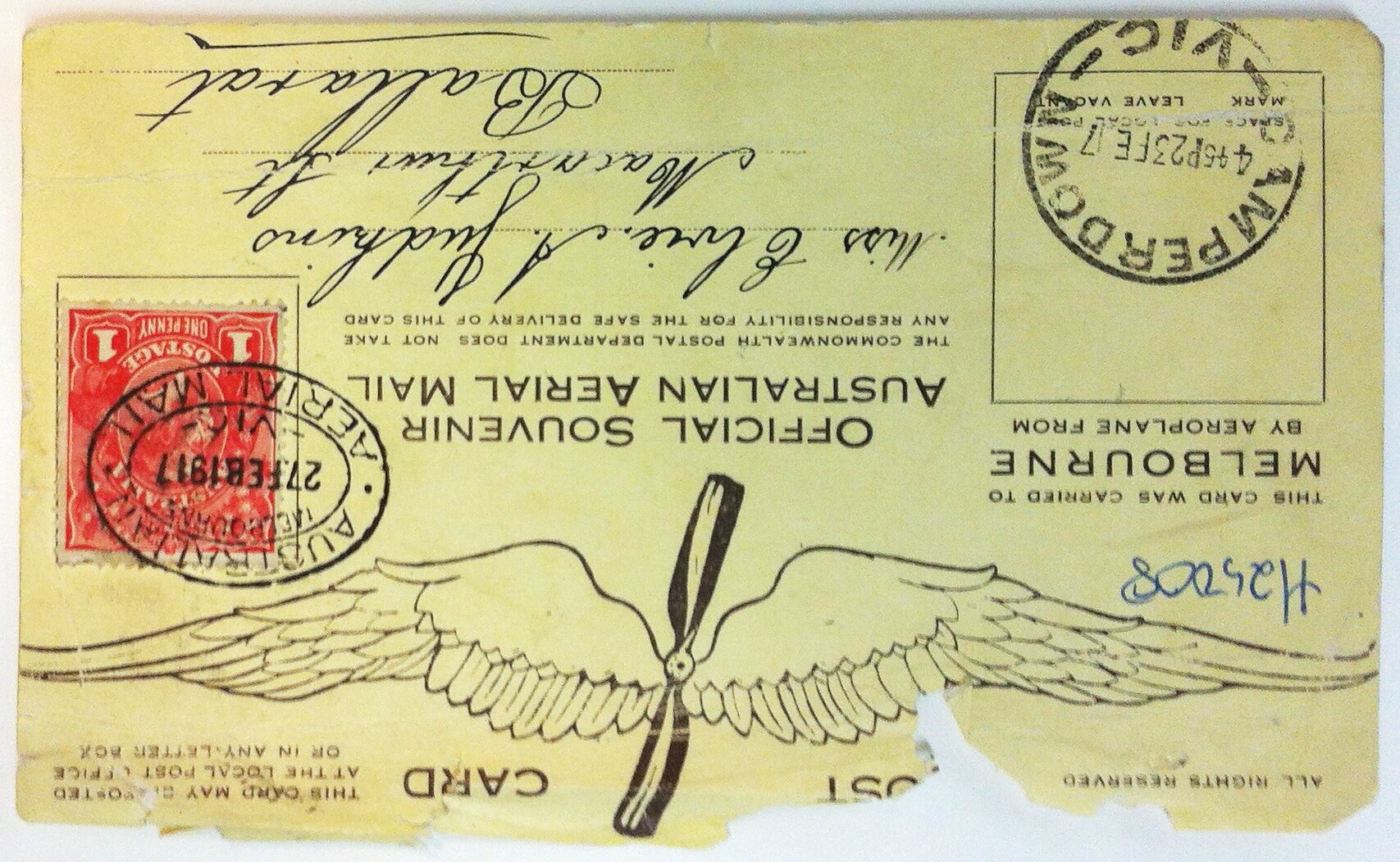 Postcard with extensive text and a picture (monogram) of a propeller with wings printed in dark brown ink on plain white card stock. There is a red one penny stamp adhered to the postcard. It has a Camperdown postmark dated 23 Feb 1917 and a Melbourne postmark dated 27 Feb 1917. The reverse depicts a portrait of Basil Watson. The top of the postcard is damaged.