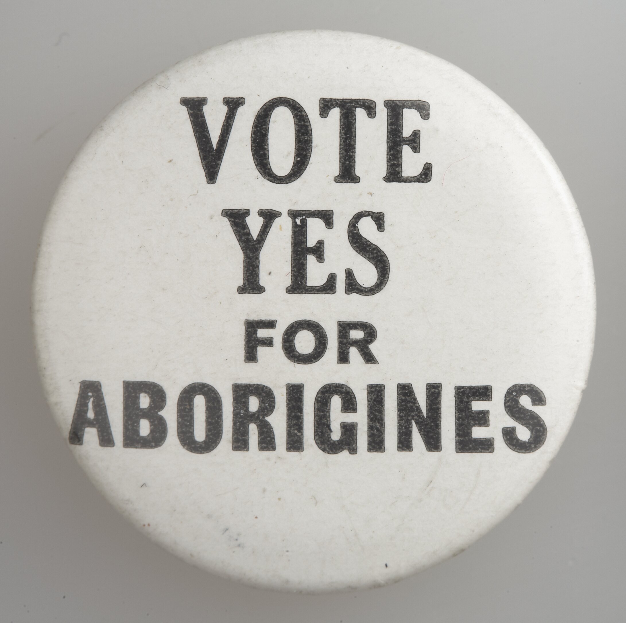 Small badge with slogan 'VOTE YES for ABORIGINES'.